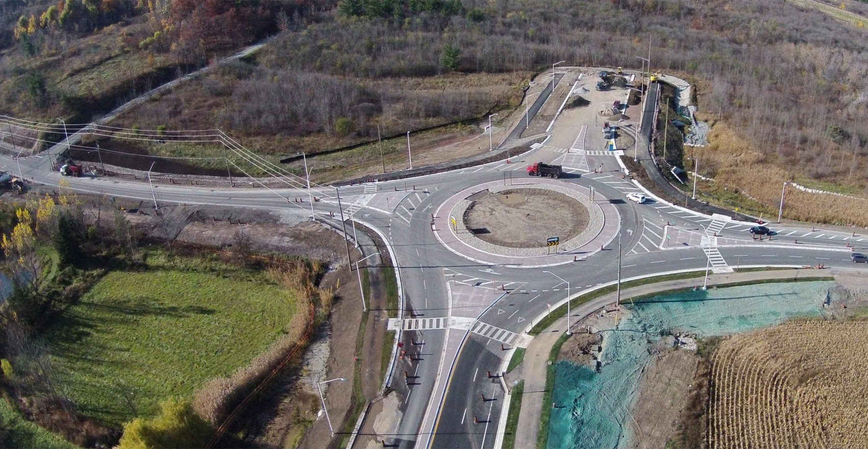 The contract included but was not limited to the realignment and reconstruction of Tremaine Road to a four lane semi-urban roadway, with the construction of underground services, the installation of culverts at Bronte Creek and 16 Mile Creek tributary crossings ranging in size from 300mm x 2100mm to a 2400mm x 1800mmm, electrical, lighting, site restoration and landscaping which included a large amount topsoil, sod and seeding as well as a large quantity of planted trees and shrubs, line painting and traffic control. Additional work involved environmental services including a fish rescue and ensuring all environmental measures were adhered to by having a Geomorphologist on site to oversee the working being done.